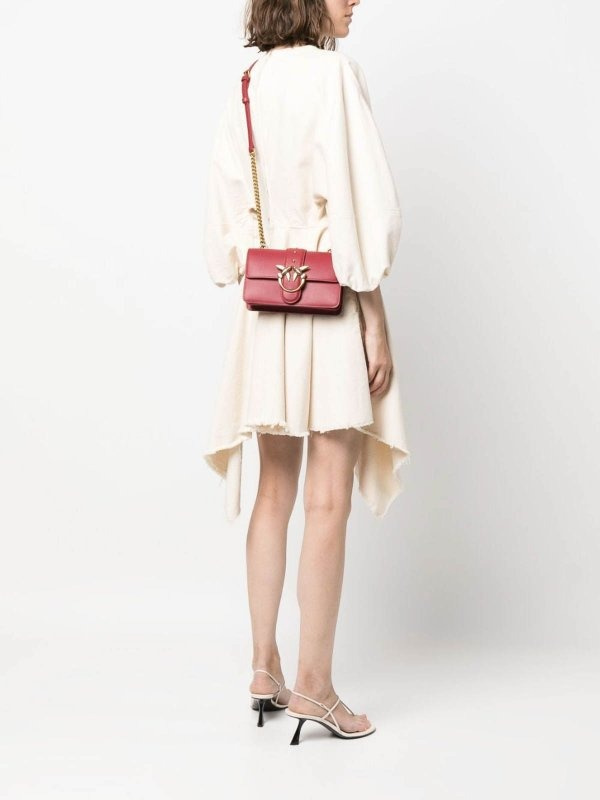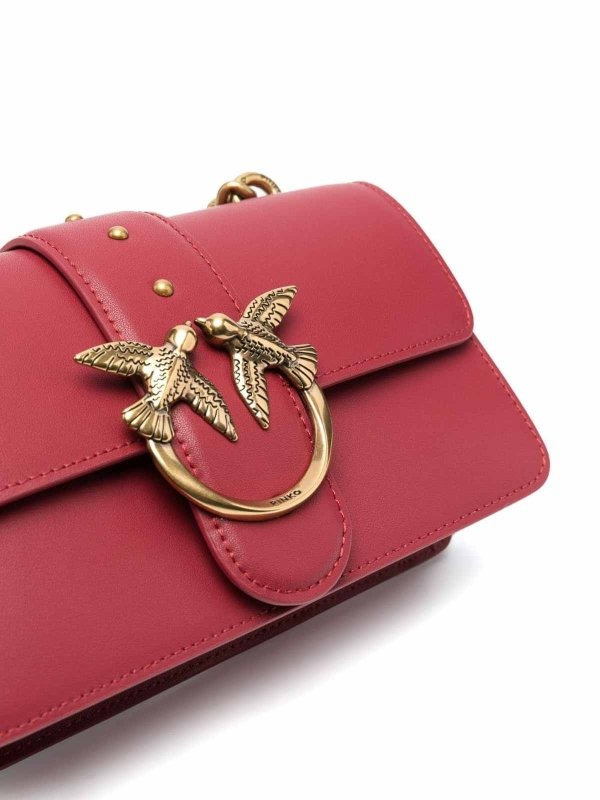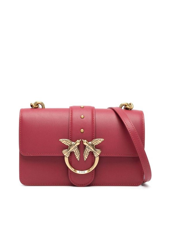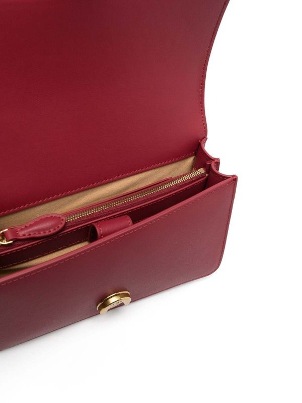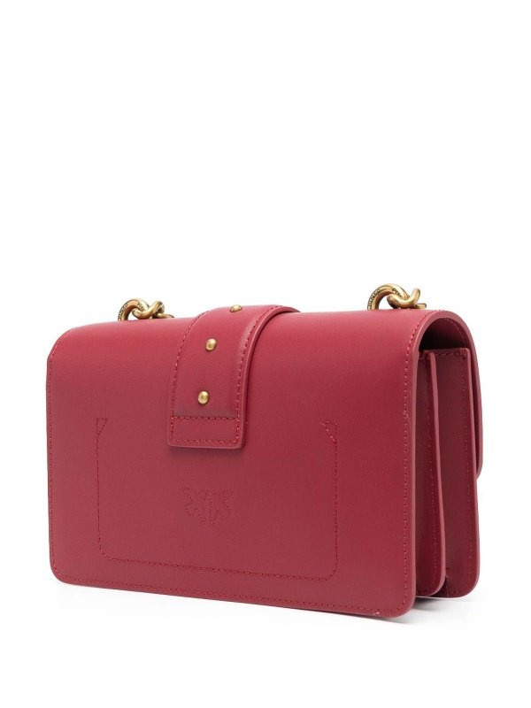PINKO 'Love one' kožna torba preko ramena s tamnocrvenom goveđom kožom u zlatnoj boji hardvera s logotipom i pločicom na preklop s kožnim kopčanjem na gumbe i lančanim remenom za rame s pregradom, unutarnjim džepom s patentnim zatvaračem i punom podstavom.
