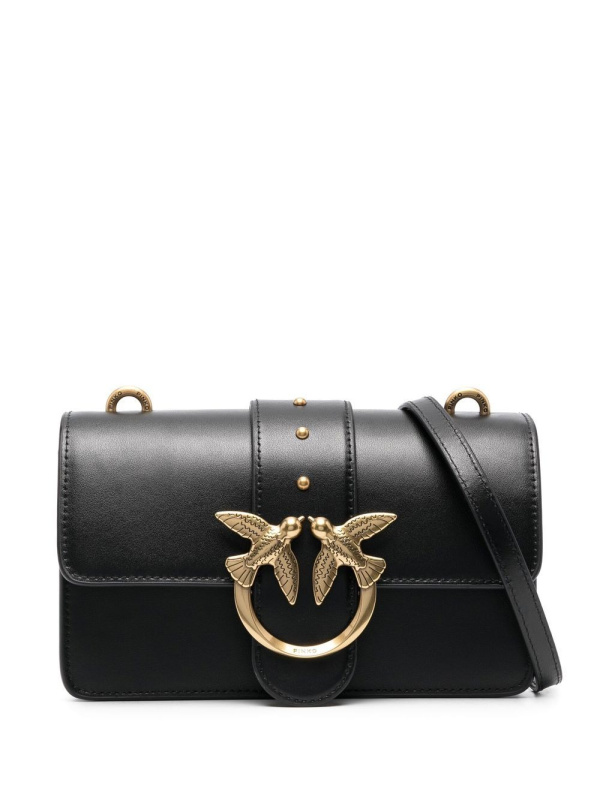 Love One mini crossbody torba iz PINKO-a koja se sastoji od tamnocrne, teleće kože, hardvera u zlatnoj boji, pločice s logotipom u zlatnoj boji, odvojive kožne i lančane naramenice, preklopnog gornjeg dijela s magnetskim kopčanjem, pregradom s pregradama i unutarnjim džepom s patentnim zatvaračem.