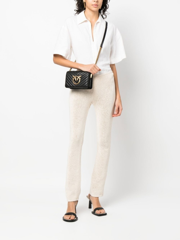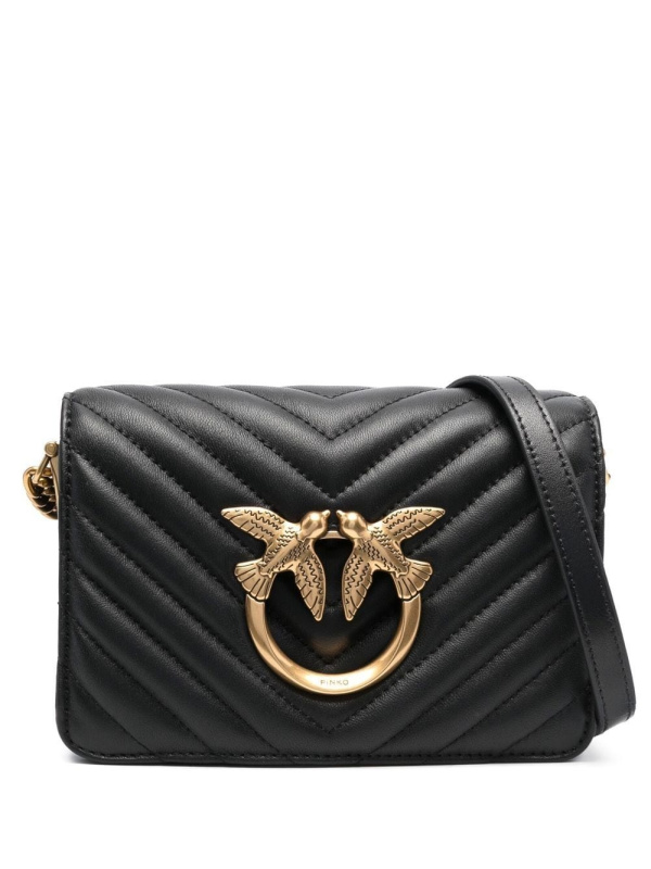 Mini 'click love' torbica prošivena chevron-om iz PINKO-a s crnom, telećom kožom, kopčom s potpisom Love Birds, gornjim dijelom na preklop s magnetskim kopčanjem, pregradom s pregradama i podesivim kožnim i lančanim remenom za rame.