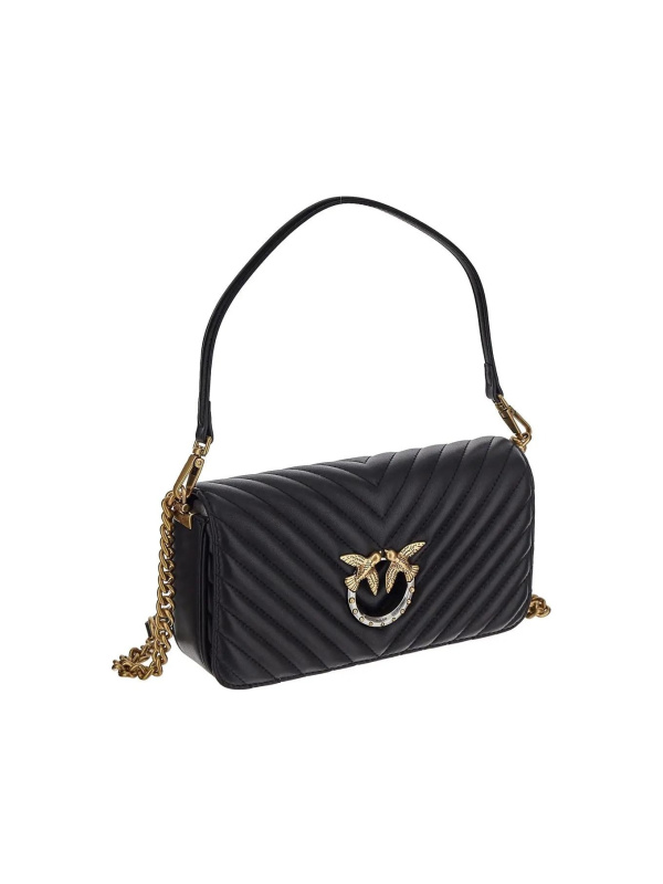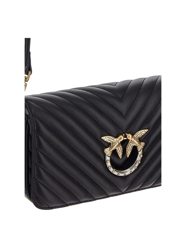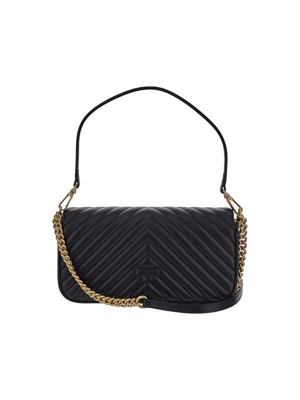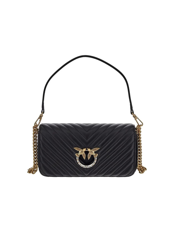 Pinko baguette torba od crne kože s prošivenim motivom i zlatnim/srebrnim izrezom s logom 'Love Birds' sprijeda.