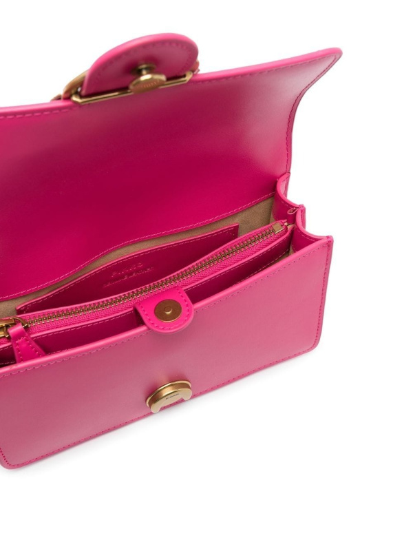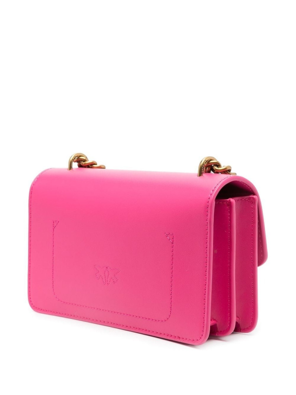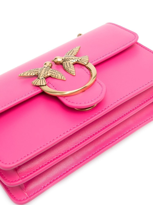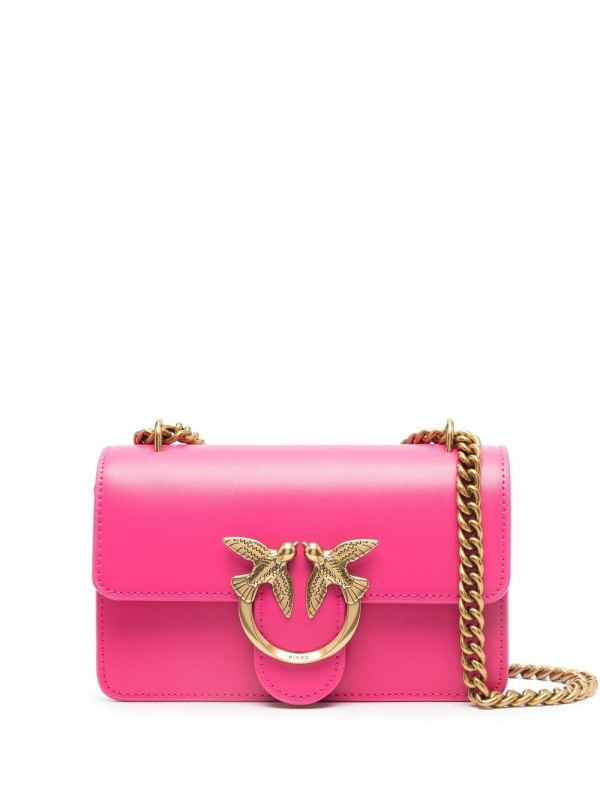 PINKO 'Love Birds' torba za rame s ružičastom, telećom kožom, prepoznatljivom kopčom Love Birds, gornjim dijelom na preklop s magnetskim kopčanjem, pregradom s pregradama, unutarnjim džepom s patentnim zatvaračem i podesivim kožnim i lančanim remenom za rame.