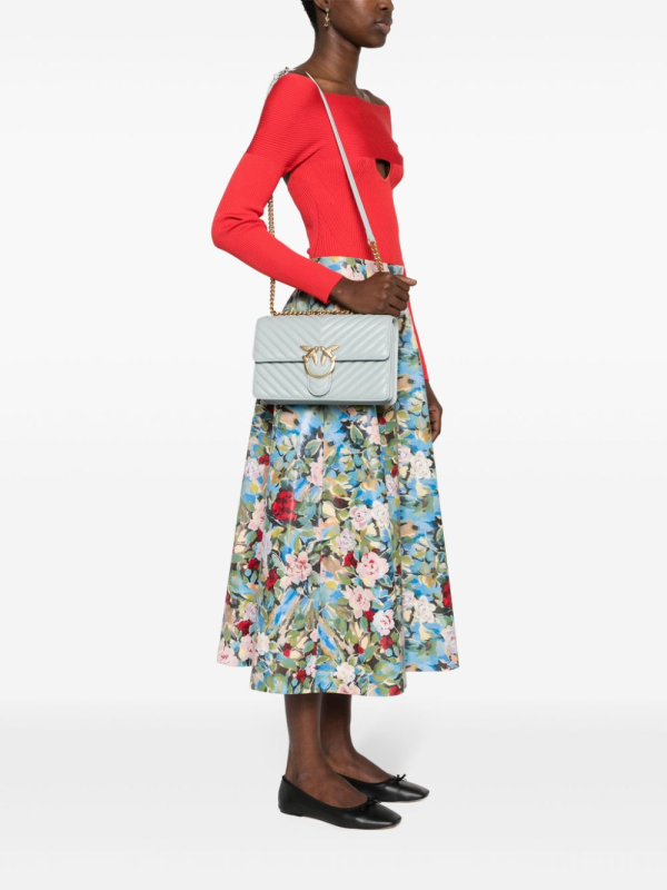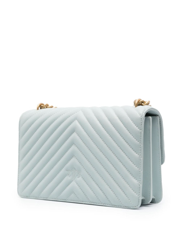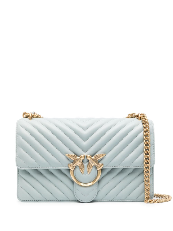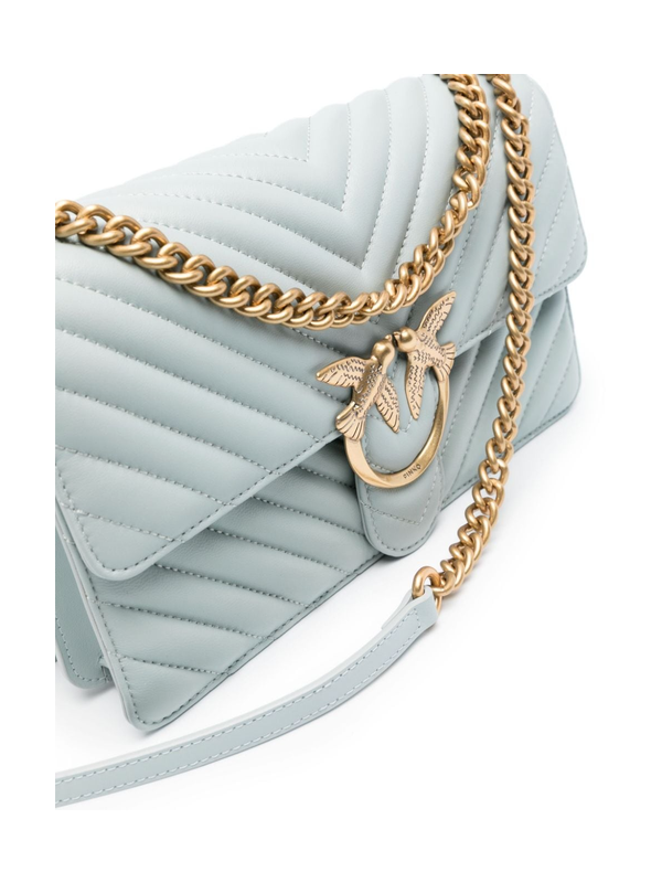 Izrađena od kože prošivene ševronima, ova plava iteracija Pinko's Classic Love One torbe za preko ramena ukrašena je zlatnim Love Birds logom
