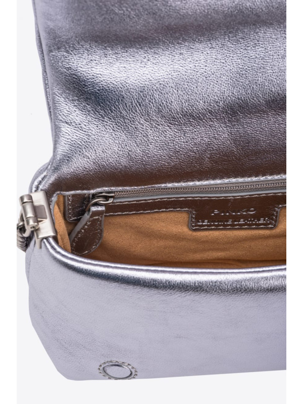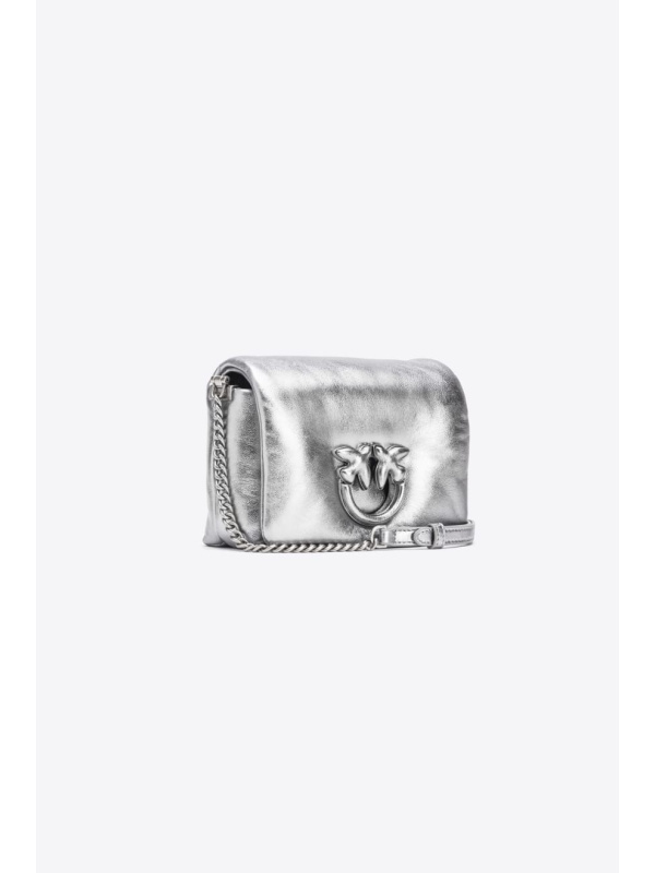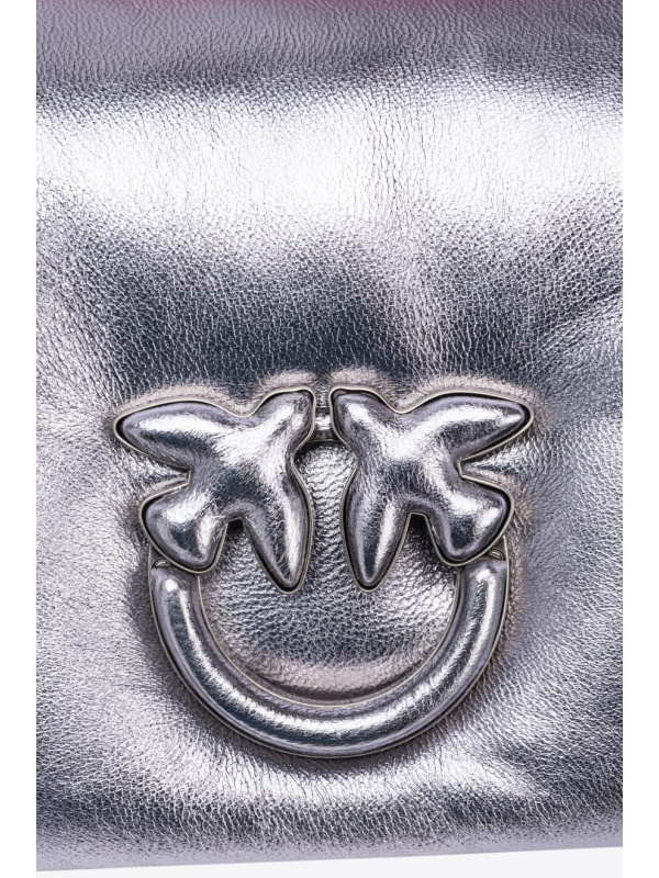 Skriveno kopčanje na tipke ukrašeno je legendarnom metalnom Love Birds Diamond Cut kopčom s efektom izreza, koja je presvučena istom laminiranom nappa kožom koja se koristi za izradu torbe. Dodatak ima podstavu od mikrofibre i džepić. Naramenica kombinira klasični okrugli metalni lančić s praktičnim podesivim kožnim jastučićem.