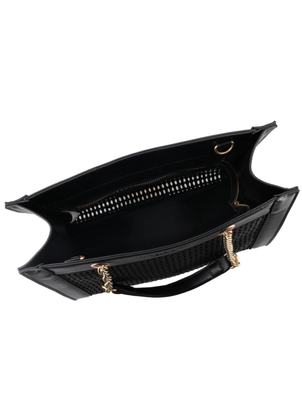 Shopper je dizajniran s elegantnim tonskim tkanim uzorkom i metalnom lančanom ručkom zlatne boje.