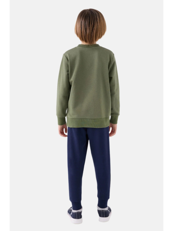 Gornji dio je udoban pulover maslinasto zelene boje s natpisom koji pruža ležeran, sportski šik vibe.