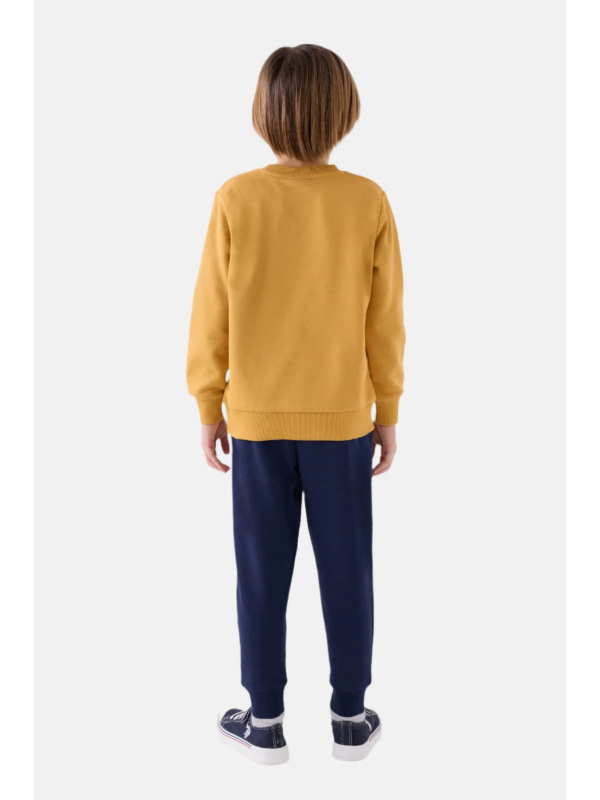 Elegantan komplet sastavljen od tople dukserice u vedroj gorčićno žutoj nijansi i udobnih tamnoplavih sportskih hlača savršen je izbor za casual prilike.