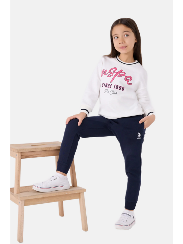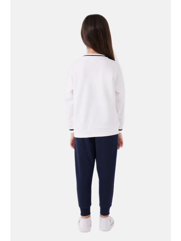 Udobna trenerka u klasičnoj kombinaciji bijele i tamno plave boje idealna je za sportske aktivnosti ili opušteni dnevni look.