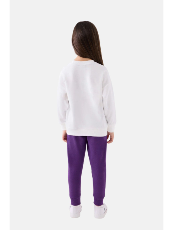 Djevojčica nosi skladan sportski komplet bijele tople dukserice s natpisom u ljubičastoj boji i trenerke u intenzivnom ljubičastom tonu što stvara dinamičan i mladalački izgled.