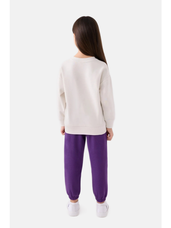 Komotna trenerka u kombinaciji pastelno bijele boje gornjeg dijela i živahne ljubičaste boje donjeg dijela nudi spoj udobnosti i modernog stila za svakodnevne aktivnosti.