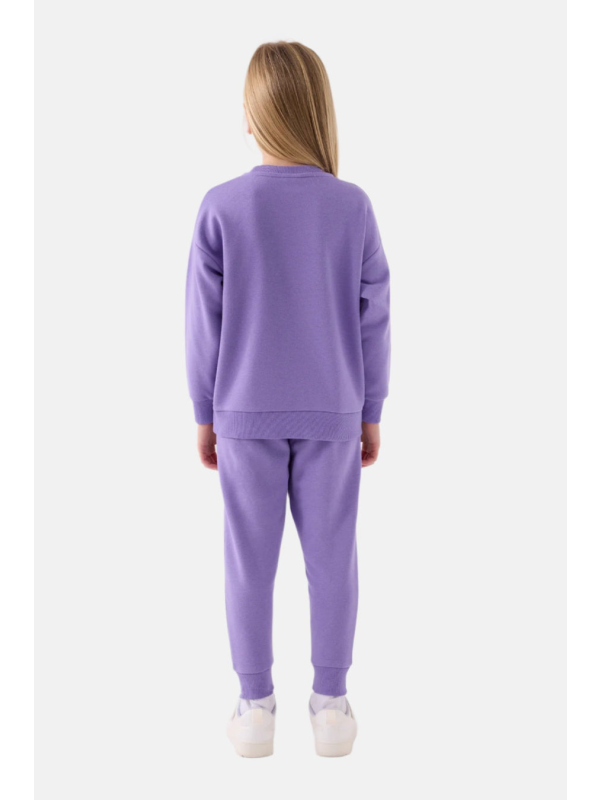 Elegantan komplet u ljubičastoj boji sastoji se od udobnog duksa i hlača, idealan za svakodnevno nošenje.