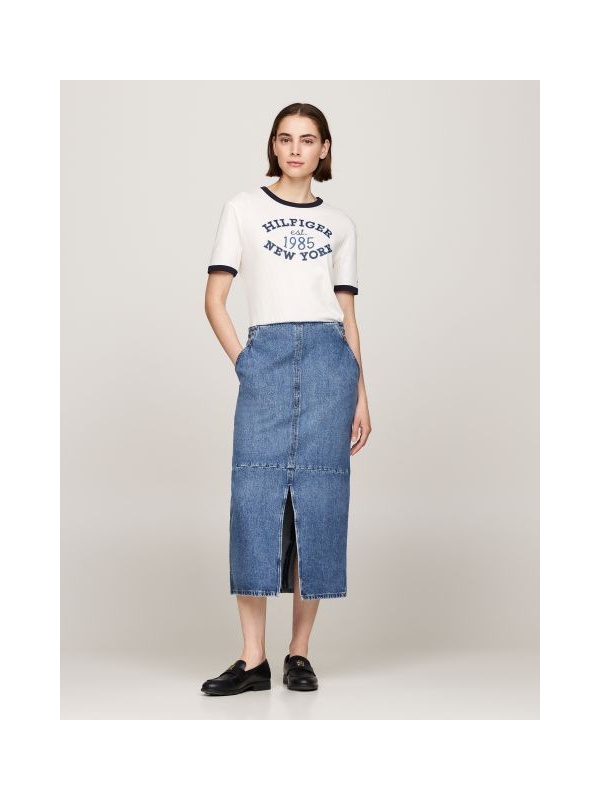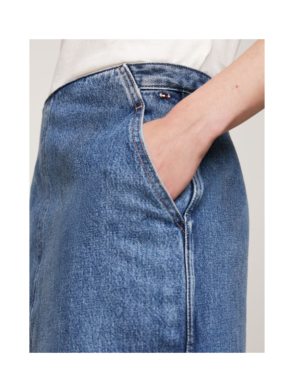 Kada je riječ o osnovnim stvarima za toplo vrijeme, ova uska traper suknja – završena suvremenim premazom – svestrana je opcija.
