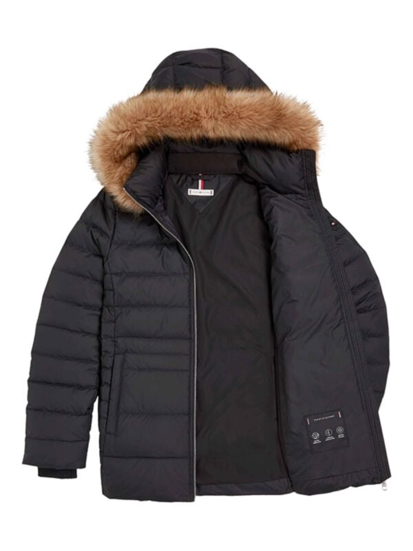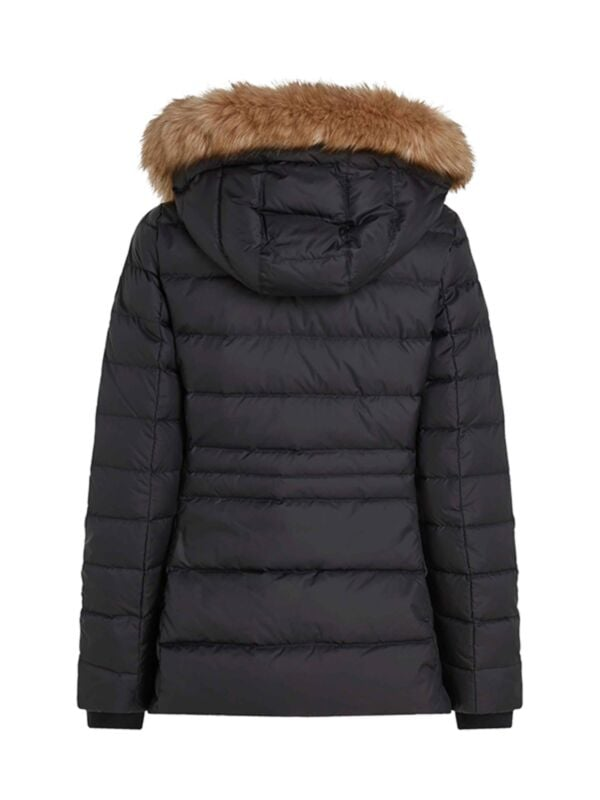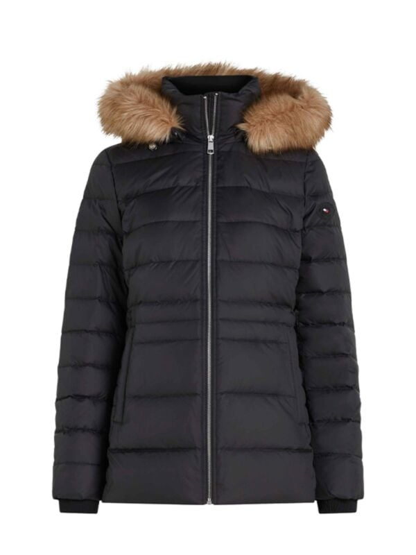 Ženska crna Tommy HIlfiger Tyra prošivena jakna s kapuljačom od eko krzna