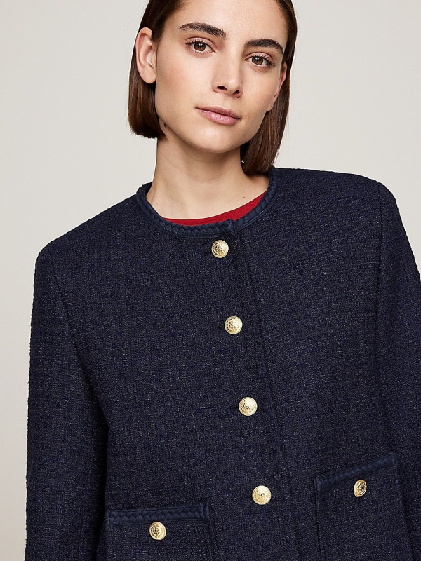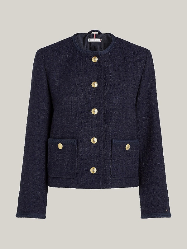 Sa svojim gumbima s reljefnim TH grbom i naznakama metaliziranih niti, ova kutijasta jakna čini chic statement komad