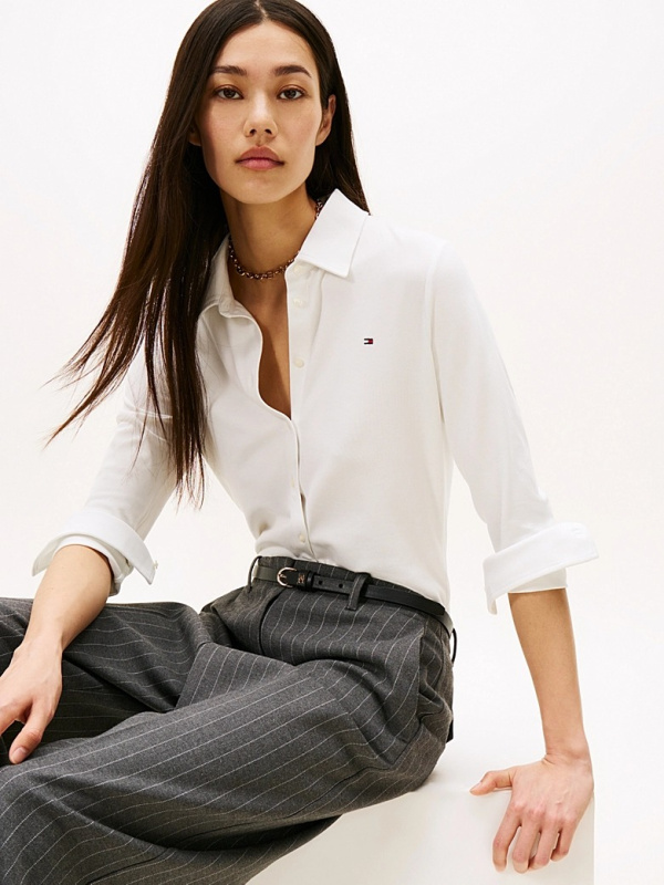 Ova uska košulja ima pike teksturu i kopčanje na gumbe cijele duljine, kombinirajući klasični polo stil s elegantnom estetikom.